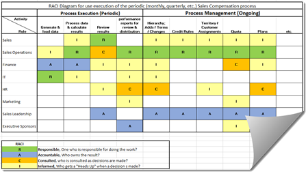 - RACI (Responsible, Accountable, Consulted, Informed) Workbook for the Sales Compensation Process.